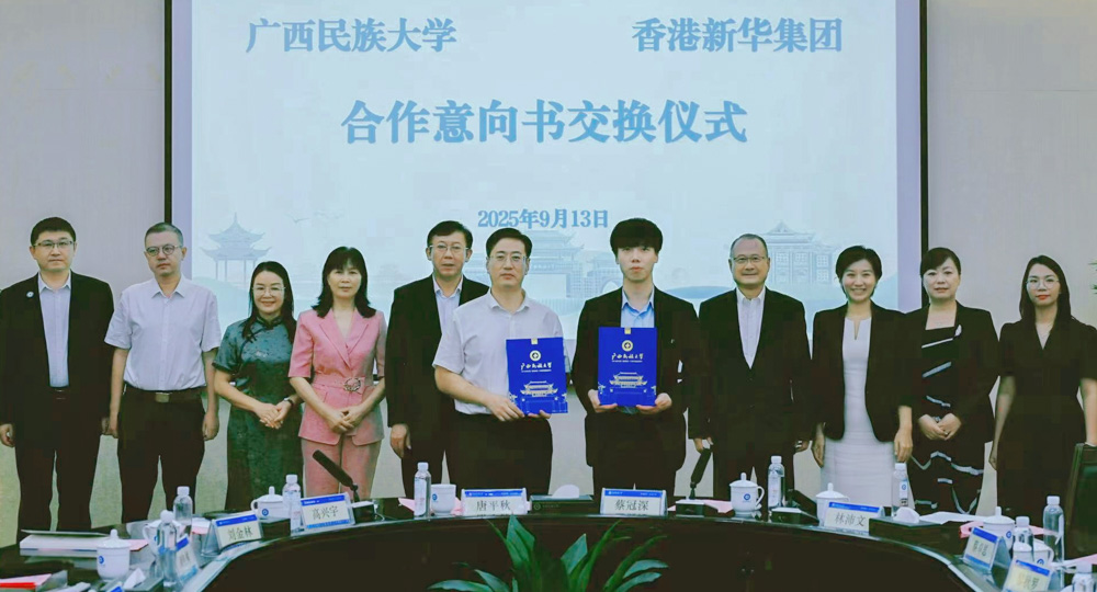 On the morning of September 13, 2025, Dr. Jonathan Choi, Standing Committee Member of CPPCC, Chairman of the Guangdong-HK-Macao Bay Area Entrepreneurs Alliance and Sunwah Group, visited Guangxi Minzu University in Nanning. Discussions were held on cooperation in areas such as language training, cultural exchange, joint talent cultivation, and artificial intelligence. During the meeting, Sunwah Group and Guangxi Minzu University signed a letter of intent for cooperation.