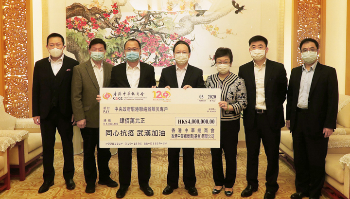 On 3 March, Dr.Jonathan Choi and Vice-chairmen represented the Hong Kong Chinese General Chamber of Commerce to present a cheque of HK$4 million to support anti-epidemic activities in the Mainland. Liaison Office of the Central People's Government in HKSAR Deputy Director Tan Tie-niu received the cheque on behalf of the Mainlanders. The total donation to date accumulated to HK$30 million.