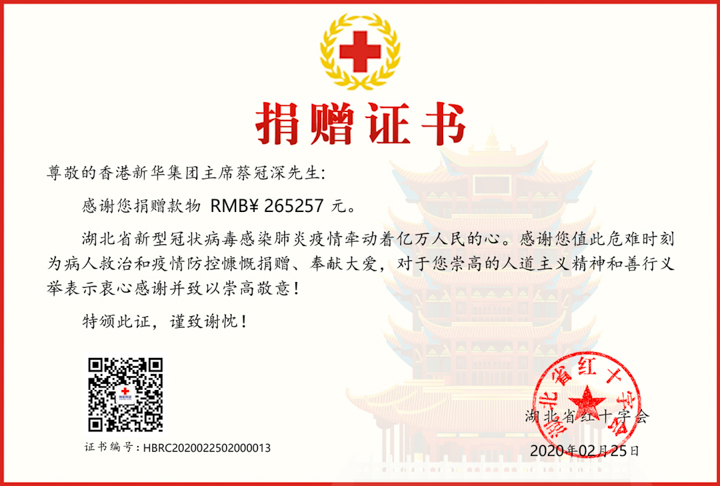 The certificate of donation of anti-epidemic materials to the Hubei Red Cross in February.